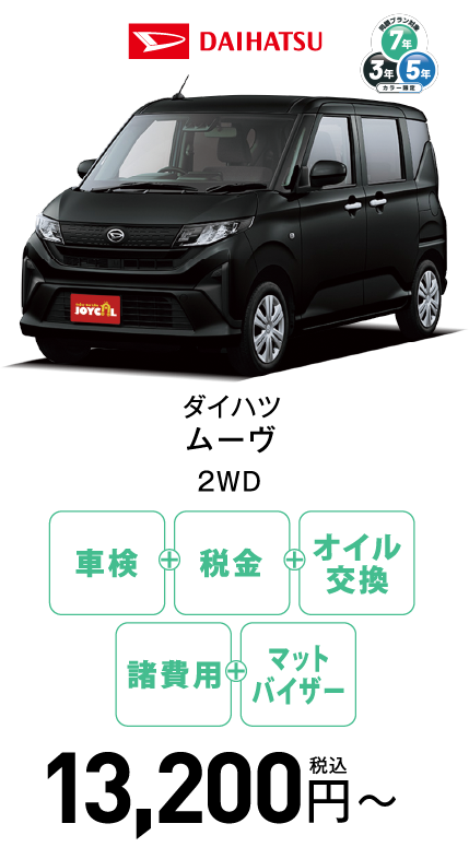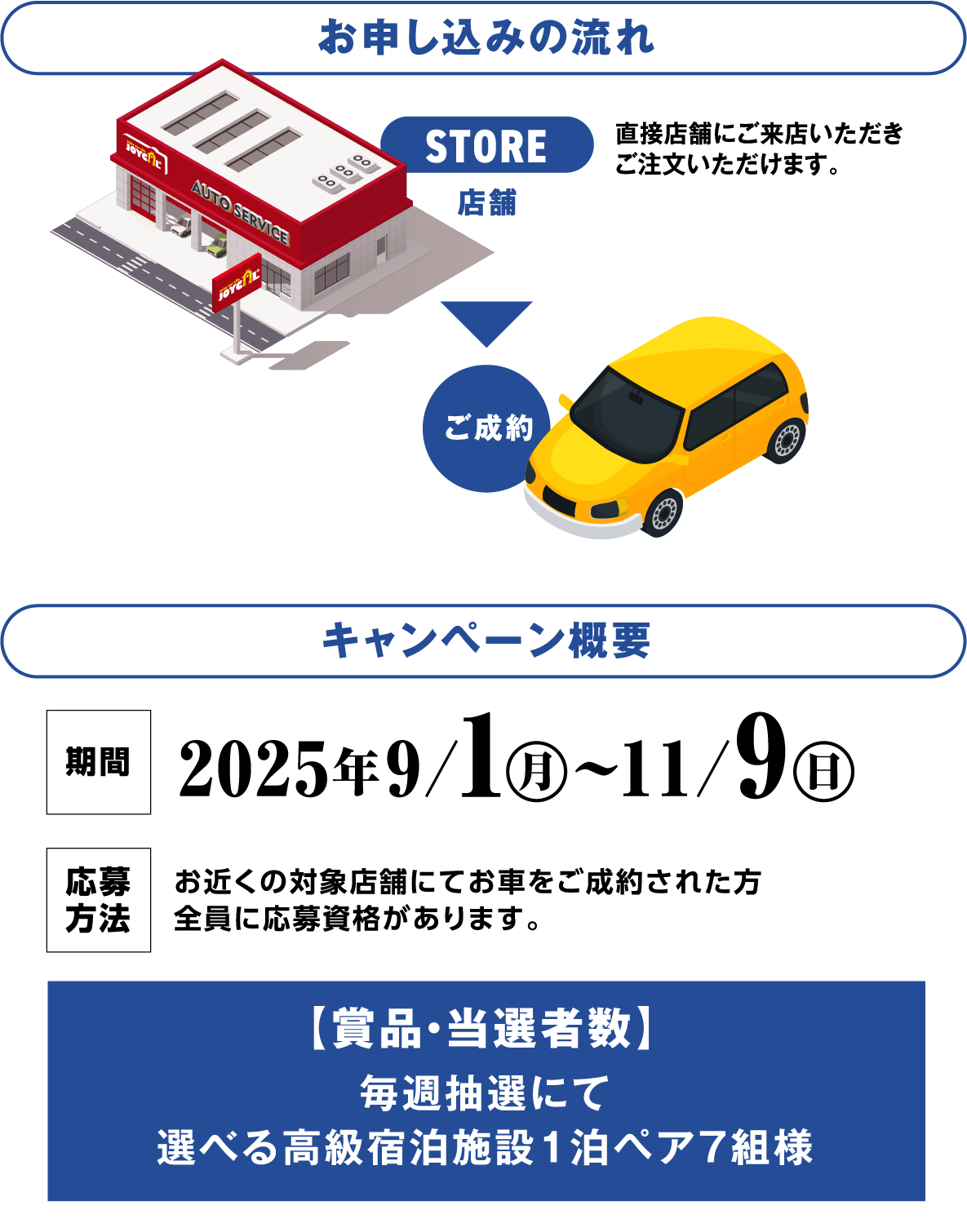 - ●ご応募は期間中お一人様一回限りとさせていただきます。(複数応募は無効といたします)●ご応募に関して不正な行為があった場合、当選を取り消させていただく場合がございます。●本キャンペーンの適用は当選者ご本人が買主・登録名義人の場合に限ります。●ご当選者が普通自動車の運転可能な免許を保有していない場合、及び車庫証明の取得が出来ない場合は当選の権利は無効となります。●その他、当選後に弊社の定めた応募要件を満たしていないことが判明した場合は当選を取り消させていただく場合がございます。●当選の権利を金銭その他の物品と交換することはできません。また、第三者に当選権利を譲渡することもできません。関係者の応募はできません(社員・関連会社社員及びその親族)。ジョイカルの店舗にて新車・中古車(全国産メーカー対象、一部輸入車を除く)購入の方が対象となります。●当選発表日以前にご成約済みの車両にさかのぼって適用することはできません。●弊社にて取得したお客様の「個人情報」は、車両販売・整備・保険事業における商品発送や関連のサービスの実施、又は、新車・サービスに関する情報やその他商品・サービス・イベントキャンペーンなどのお知らせの為に利用します。●その他、個人情報の取り扱いに関しては、【個人情報保護方針】をご覧ください。