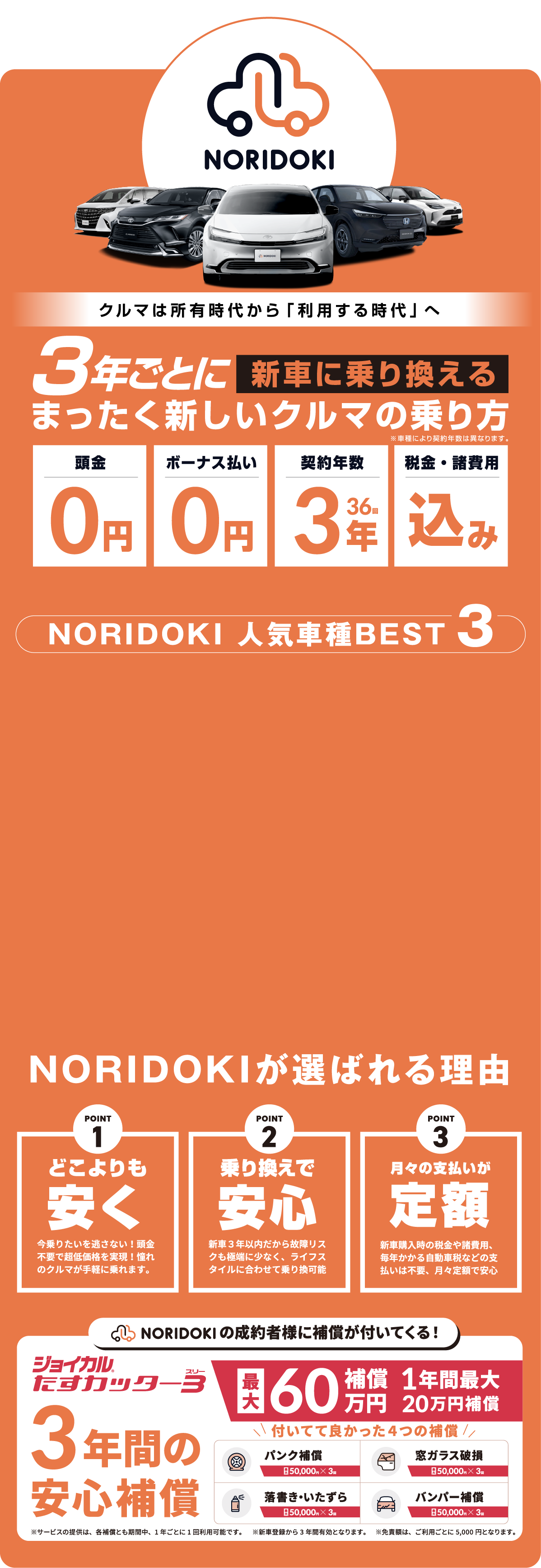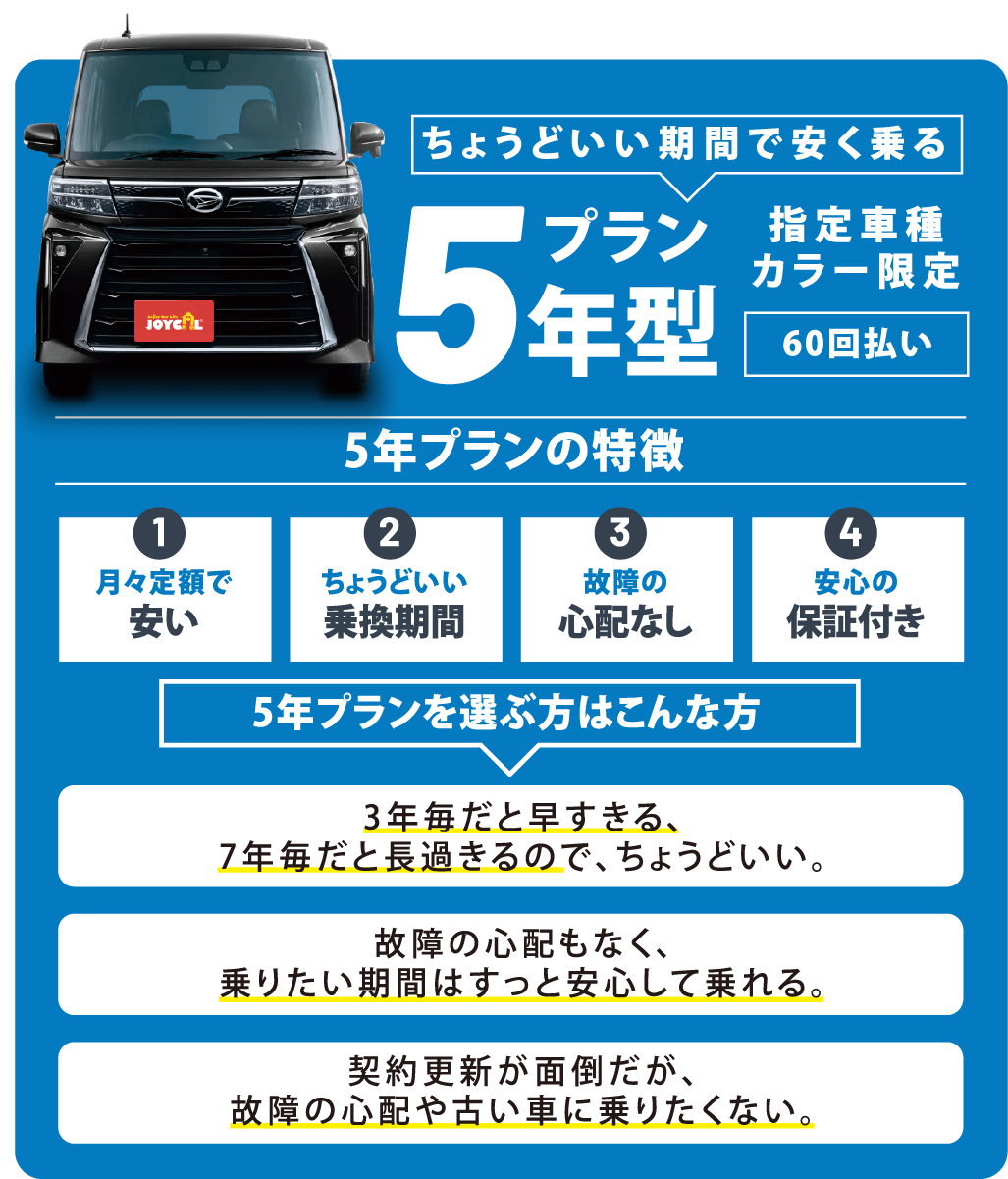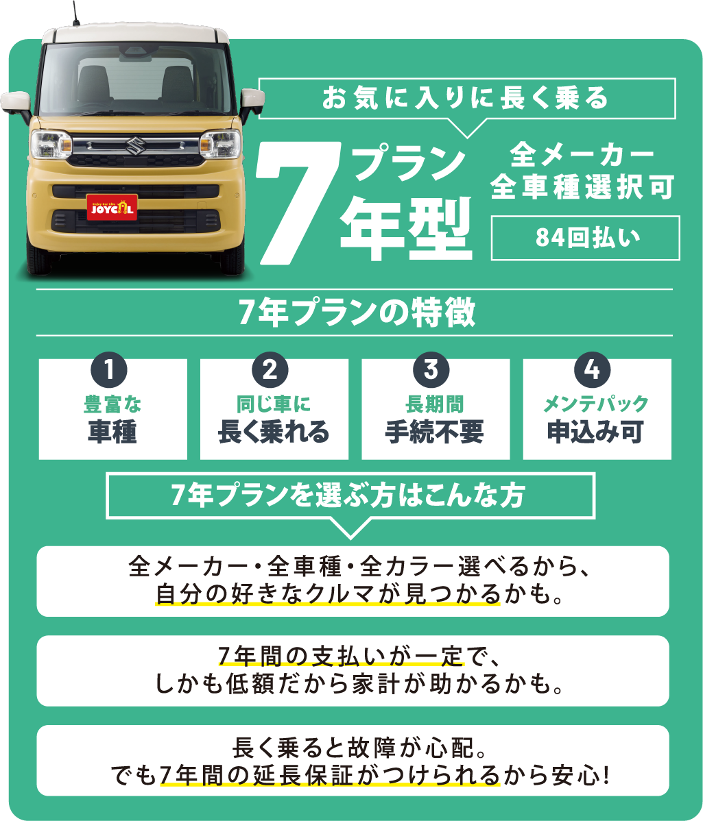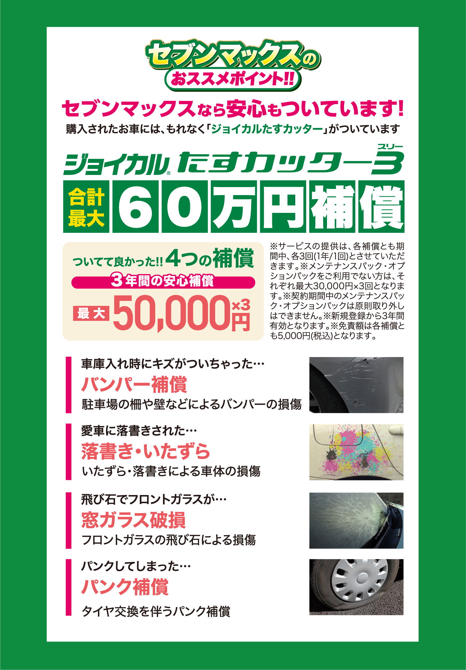 - ●新車購入時に付帯されたオプション品の代金の一部としてご利用になれます。●ご応募は期間中お一人様一回限りとさせていただきます。(複数応募は無効といたします)●ご応募に関して不正な行為があった場合、当選を取り消させていただく場合がございます。●本キャンペーンの適用は当選者ご本人が買主・登録名義人の場合に限ります。●ご当選者が普通自動車の運転可能な免許を保有していない場合、及び車庫証明の取得が出来ない場合は当選の権利は無効となります。●その他、当選後に弊社の定めた応募要件を満たしていないことが判明した場合は当選を取り消させていただく場合がございます。●当選の権利を金銭その他の物品と交換することはできません。また、第三者に当選権利を譲渡することもできません。関係者の応募はできません(社員・関連会社社員及びその親族)。●ジョイカルの店舗にて新車・中古車(全国産メーカー対象、一部輸入車を除く)購入時(セブンマックス・NORIDOKI・ハーフマックス・コミかるが対象)の代金の一部としてご利用になれます。●当選発表日以前にご成約済みの車両にさかのぼって適用することはできません。●弊社にて取得したお客様の「個人情報」は、車両販売・整備・保険事業における商品発送や関連のサービスの実施、又は、新車・サービスに関する情報やその他商品・サービス・イベントキャンペーンなどのお知らせの為に利用します。●その他、個人情報の取り扱いに関しては、 【個人情報保護方針】をご覧ください。